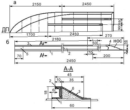 2230; 3 - полоса 1,5×60, L = 2180; 4 - носовой наконечник; 5 - кормовой