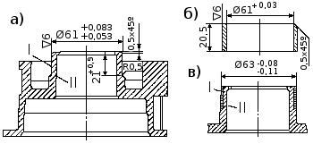 Рис. 6. Восстановление посадочной поверхности картера: а — обработка поверхности для запрессовки кольца (несоосность поверхности I относительно II не более 0.1 мм); б — кольцо; в — отремонтированная посадочная поверхность.