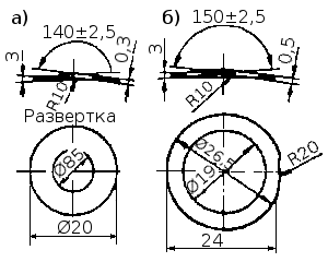 Рис. 7. Шайбы пружинные: а — малая 2.131-003; б — большая 2.131-004. Материал — сталь У9, У9А. Толщина — 0.3 мм. Твердость — HRC45-50. Допускается изготовление из ленты УВА