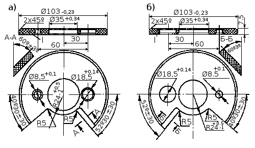 Рис. 9. Золотниковые шайбы: а — верхняя 2.131-001; б — нижняя 2.131-002. Материал — текстолит ПТ1 (ПТК, ПТ), ГОСТ5—52. Неплоскостность поверхности I — не более 0.05 мм