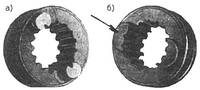 Рис. 57. Муфты: а — до модернизации; б — после нее (ясно видно усиление уступа).