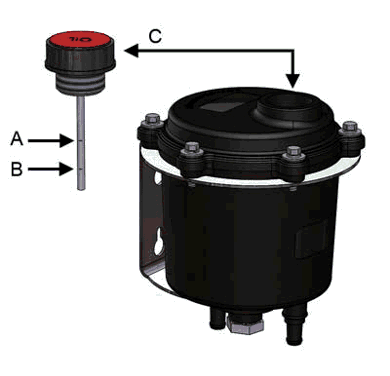 В системе должен быть достаточный уровень масла. Чтобы добавить масло в систему, необходимо долить масло в резервуар через крышку (рис. 21, точка C). К крышке резервуара прикреплен щуп с отметками максимального и минимального уровня (рис. 21). Следует помнить, что замену масла необходимо производить раз в сезон эксплуатации. Рисунок 21. Проверка уровня масла A Максимальный уровень |