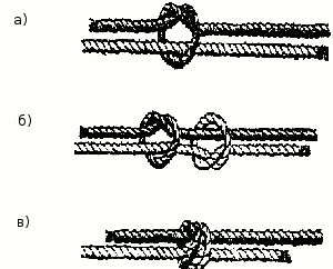 На некотором расстоянии от конца одного из связываемых тросов завязывают полупрямой узел (рис. 41 а). В петлю этого узла вводят конец другого троса, на котором также завязывают полупрямой узел, охватывающий первый трос (рис. 41 б). Затянутый узел показан на рис. 41 в.