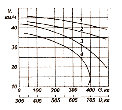 Рис. 17. Зависимость скорости мотолодки «Сарепта» от нагрузки G и