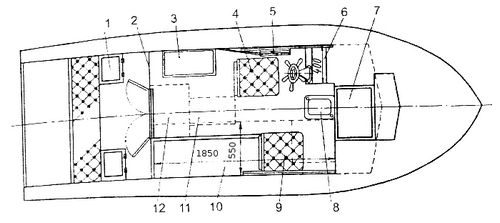 9 - место штурмана; 10 - рундук; 11 - бачок питьевой воды; 12 -
