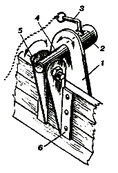 бортового шверца. 1 - шверц; 2 - втулка; 3 - штырь; 4 - ось; 5 - болт; б -