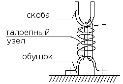 В тех случаях, когда блоку или какому-либо устройству достаточно ограниченной свободы, используют пару такелажных скоб или нечто подобное. В отдельных случаях вместо такой пары можно применить талрепный узел.
