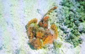 Скорпена маскируется, приобретая цвет фона, однако на этот раз она ошиблась. Ночью рыбы обычно краснеют, что облегчает задачу их обнаружения на фоне кораллов в прямом свете фонаря. Бородавчатки и скорпеновые малоподвижны. И те и другие обычно маскируются настолько умело, что ничего не стоит положить на них руку