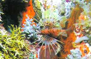 Пятнистая львиная скорпена на фоне разнообразных кораллов. В красивых лучах плавников содержится сильнодействующее жгучее вещество. Большую проблему эти рыбы представляют при ночных погружениях, когда их привлекает свет фонарей дайверов. Это малоподвижные создания, проявляющие проворство только при поедании добычи; большую часть времени они просто лежат на рифах и рэках