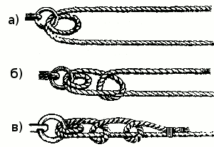 Ходовой конец троса дважды обносят вокруг причального приспособления (рис. 6 а), после чего завязывают за коренную часть троса полуштыками и закрепляют тонким линем или шкимушгаром (рис. 6 б, в).