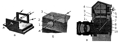 Типы видоискателей фотоаппаратов: а — рамочный; б — телескопический: 1 — корпус фотоаппарата; 2 — окуляр видоискателя — положительная линза; 3 — объектив видоискателя — отрицательная линза; в — зеркальный видоискатель с пентапризмой: 1 — объектив фотоаппарата; 2 — матовое стекло; 3 — коллективная линза; 4 — пентапризма; 5 — окуляр видоискателя; 6 — корпус фотоаппарата; 7 — задняя стенка; 8 — фотопленка; 9 — поднимающееся зеркало; 10 — шторно-щелевой затвор