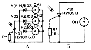 Синхроконтакт — устройство, расположенное в затворе и предназначенное для включения импульсного осветителя в момент работы собственно затвора. Для бескабельного управления фотовспышкой применяютсветосинх-ронизационную схему поджига одной или нескольких газоразрядных ламп — см. схемы: А — при использовании данной схемы с несколькими разнотипными импульсными осветителями исключено их взаимное влияние во время работы, поскольку оно блокируется диодами VD1 —VD3 (с одним фототиристором можно использовать не более 2—3 фотовспышек при невысокой емкости конденсатора); Б — эта схема применяется с одним осветителем любой конструкции, дальность действия на воздухе около 20 м при мощности ведущей фотовспышки 100 Дж (под водой она будет гораздо меньше, поэтому для сохранения высоких эксплутационных характеристик прибора придется устанавливать схему усиления светового импульса).