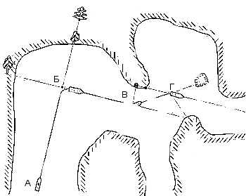 На представленном рисунке схематично показано, что судоводитель из точки А следует на катере по линии, соединяющей два приметных и отстоящих друг от друга на расстоянии дерева. В точке Б катер ложится на курс таким образом, чтобы нос судна был направлен на оконечность выступающего приметного мыса, а строго по корме находилось приметное (одиночное) дерево. При этом катер находится на линии, соединяющей указанные приметы. Когда с левого борта под прямым углом к курсу (на траверзе) будет находиться большой валун, а справа - левый берег впадающего в реку ручья (точка В), катер направляется курсом на центр небольшого острова и в точке Г на траверзе ранее упомянутого мыса, поворачивает вправо так, чтобы находящиеся по корме приметный одиночный камень (ближний ориентир) и валун были на одной линии (в створе). Примерно по этому сценарию действуют судоводители маломерных судов на водных объектах, не имеющих навигационной обстановки. При этом ориентиры (приметы) и курсы относительно их выбираются судоводителем на практике для различных уровней воды в процессе самостоятельного плавания и сведений, получаемых от других знающих данный участок судоводителей.