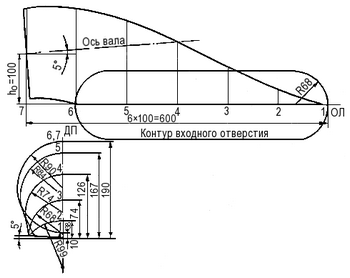 Для обеспечения плавного подтока воды к движителю входное сечение водометной трубы обычно выполняют овальной формы с соотношением сторон 1вх/bвх = 3 — 5, при этом ширину входного отверстия bвх или принимают равной диаметру трубы Dт, или уменьшают до bвх ≈ 0,75Dт. Назначая размеры водозаборного отверстия, необходимо соблюдать следующее условие: угол передней стенки трубы бвх не должен превышать 30-35° (во избежание завихрения потока).