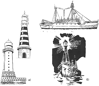 Рис. 198. Виды маяков: а) береговые; б) плавучие