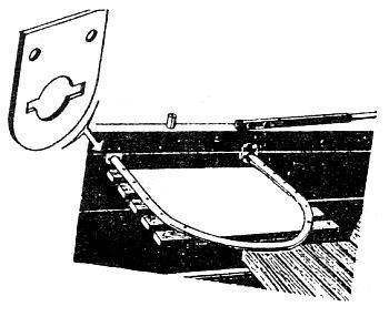 Для этого никакой переделки их не требуется, на заднюю сторону спинки крепится на шурупах или на клею пластина из пластика, текстолита или фанеры. Для крепления стола к комингсу надо изготовить четыре ушка (рис. 34), которые с помощью винтов и гаек крепятся к угольнику под палубой.