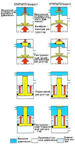 Принципиальная схема первых ступеней регулятора. Красные стрелки обозначают давление пружины, черные точки — кольцевые уплотнители