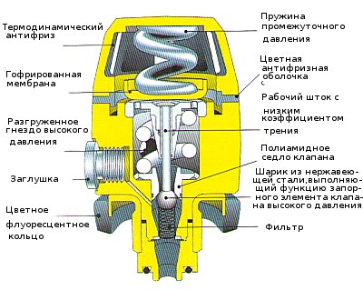 Современные вторые ступени имеют впускные клапаны, открывающиеся по потоку воздуха. В холодной воде металлические элементы конструкции (пусть и более тяжелые, чем пластиковые) поглощают тепло выдыхаемого воздуха и снижают вероятность замерзания