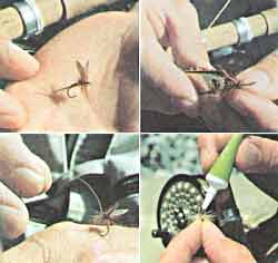 Рис. На фотографиях показаны отдельные моменты изготовления сухой мушки; последняя стадия — нанесение на крючок силикона для увеличения плавучести крючка с насадкой