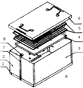Рис. 7. Коптильня складная. а - Подготовка к работе. Вставьте в основание (1) коптильни торцевые стенки (2); вставьте в пазы отбортовок торцевых стенок продольные стенки (3). Уложите на дно основания (1) ровным слоем сухую щепу или ветки для наработки дыма, установите на нижний ряд уголков на продольных стенках поддон (4) для сбора сока и жира, установите над поддоном на уголках продольных стенок две или одну решетки (5) с продуктом для копчения. Закройте все крышкой (6); зацепите за скобы на основании стяжки большие (7) с винтами (8) и зафиксируйте всю сборку, обжав слегка крышку винтами. Оптимальные условия для копчения установить коптильню на работающем таганке от кухни походной КП-1. Допускается устанавливать коптильню непосредственно на угли или какую-либо подставку.