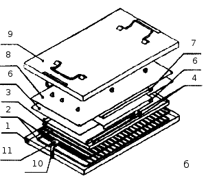Рис. 7. Коптильня складная (продолжение). б - Подготовка к транспортировке. Уложите в основание (1) коптильни две решетки (2), положите на решетки поддон (3), уложите в поддон две большие стяжки (4). Положите сверху на поддон продольную стенку (5) уголками вниз; накройте эту стенку торцевой стенкой (6), уложив ее отбортовкой вниз; положите на торцевую стенку вторую торцевую стенку (7), но уже отбортовкой вверх.Положите на вторую торцевую стенку вторую продольную стенку (8) (уголками вверх). Накройте всю сборку крышкой (9); Зацепите за скобы на основании стяжки малые (10) с винтами (11) и зафиксируйте всю сборку обжав крышку винтами.