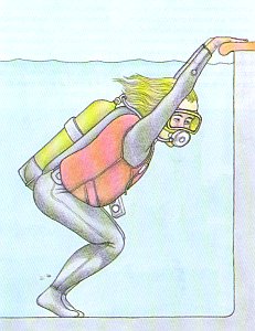 Возьмите в рот загубник основной второй ступени, наденьте маску и спуститесь в воду в мелкой части бассейна. Далее вы должны научиться правильно утяжеляться. На вас надето все снаряжение, которым вы собираетесь пользоваться в бассейне. Убедитесь, что в случае возникновения проблем вы сможете быстро избавиться от грузового пояса.