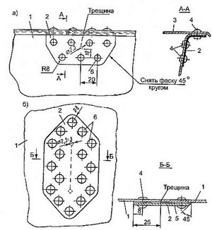 Рис. 7. Ремонт трещины в узле соединения борта с палубой (а) и в листе обшивки (б). 1 - лист обшивки; 2 - накладка; 3 - лист палубы; 4 - заклепка 03; 5 - уплотнительная лента; б - заклепка Ø4.