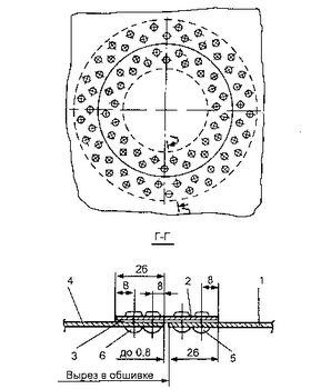 В вырез заподлицо с обшивкой ставится круглая заделка-вкладыш так, чтобы зазор между вкладышем и кромкой выреза не превышал 1 мм. Вкладыш проклёпывается с накладкой однорядным швом шагом 20 мм (рис. 8).