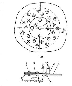 лист обшивки; 2 - кольцевая накладка; 3 - уплотнительная лента; 4 - вкладыш; 5,6