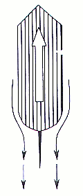 Если на переднем ходу при выключенном двигателе и прямом положении руля встречные струи воды обтекают корпус и руль симметрично, не вызывая сил, уклоняющих нос или корму судна (рис. 16), то при отклонении руля на некоторый угол вправо (рис. 17) на него начинают давить встречные струи с какой-то силой F. а с левой стороны руля образуется разряженное пространство.