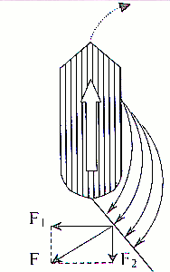 Сила F является равнодействующей сил F1 и F2. При этом сила F2 действует в противоположном направлении движению катера и следовательно уменьшает его скорость, а сила F1 отбрасывает руль с кормой влево, тем самым обеспечивается поворот носа катера вправо На этом примере делается вывод: нос катера на переднем ходу покатится в ту сторону, в какую положен руль.