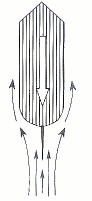 На заднем ходу при выключенном двигателе и прямом положении руля сил, уклоняющих корму не появляется. Поэтому катер будет двигаться без изменения направления (рис. 18)