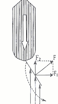 Если руль положить вправо, то встречные струи воды начнут давить на его левую какой-то силой F перпендикулярно рулю (рис. 19).