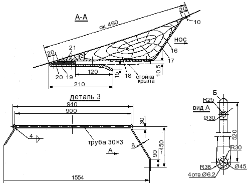 Эксцентричные втулки верхних кронштейнов устанавливаются на текстолитовых прокладках толщиной 1 мм, необходимых для того, чтобы исключить "прикипание" втулок при коррозии. Листовой текстолит можно заменить фторопластом или капролоном. После полной затяжки болтов втулки должны вращаться в кронштейне довольно туго. Риски на торце фланца втулки служат для контроля изменения углов атаки во время эксплуатации лодки. Поворот эксцентричной втулки на 15° соответствует изменению угла установки крыла около 20', а поворот на 180° — изменению угла установки на 2,5°.