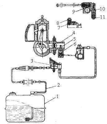 Топливный насос (рис.3 поз. 3) служит для принудительной подачи топлива из бака к карбюратору. Насос диафрагменного типа приводится в действие изменением давления в полости кривошипной камеры верхнего цилиндра в зависимости от положения поршня двигателя.