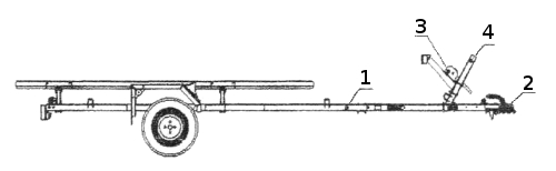 Прицеп для лодок Shark 8, Shark 9 (рис.1) состоит из следующих основных узлов: рама-1, носовой упор-2, лебедка -3, замковое устройство - 4. подвески с колесами и электрооборудования
