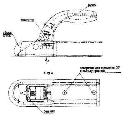 Замковое устройство (рис.3) крепиться на дышле двумя болтами и рассчитано на сцепку с шаровым пальцем диаметром 50мм. Для сцепки прицепа с автомобилем нажать на фиксатор, поднять ручку и установить замковое устройство на шар тягово-сцепного устройства (ТСУ) автомобиля. Замковое устройство автоматически обеспечивает беззазорное соединение со сцепным шаром. Замковое устройство и две страховочных цепи закреплены на дышле прицепа.