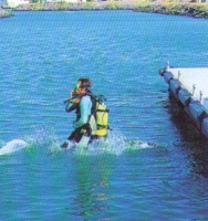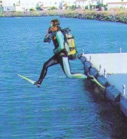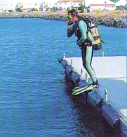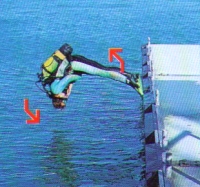 Вероятно, рядом будут и другие желающие войти в воду, поэтому присоединяйтесь к партнеру и отплывайте от пирса. При высоте пирса до 1 м можете воспользоваться другим способом вхождения в воду. Поскольку при выполнении кувырка вперед руки у вас свободны, можете захватить с собой другое снаряжение. Впрочем, хрупкое оборудование и камеру следует либо сначала опустить в воду на веревке, либо получить от кого-то в руки, находясь уже в воде.