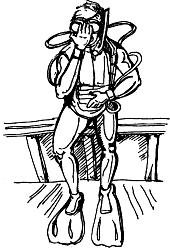 Убедитесь, что все дайверы вошедшие в воду до вас, достаточно далеко от точки вашего входа. Одной руко прижмите приборы к телу. Приложите ладонь другой руки ко второй ступен регулятора и пальцами придерживайте надетую маску. Теперь вы готовы ко входу в воду.