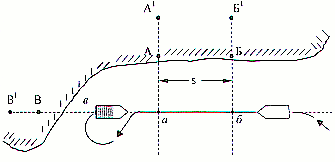 Рассмотрим пример определения скорости катера при максимальной мощности двигателя. Судоводитель, начиная движение судна из точки "в" по ведущему створу ВВ1, развивает предельное число оборотов до пересечения с секущим створом АА1. Когда катер на уровне судоводителя пересечет створ АА1 в точке "а", включается секундомер. В точке «6» секундомер останавливается и его показания записываются. По известному расстоянию S и времени его прохождения t рассчитывается скорость V.