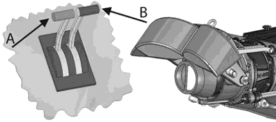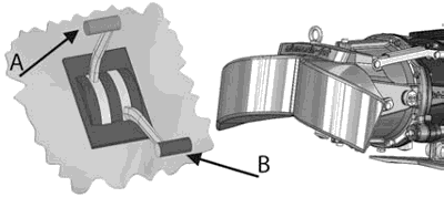 Положение сзади Когда рычаг управления реверсивной заслонкой направлен назад, заслонка блокирует струю, и судно движется назад (рис. 7). Рисунок 7. Назад: A - Рычаг дроссельной заслонки; B - Рычаг управления |
