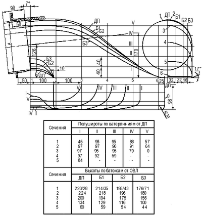 Рис. 33. Теоретический чертеж и таблица ординат водозаборника (диаметр статора 190 мм).