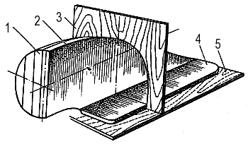 Рис. 34. Болван для формования водозаборника. 1 — цилиндрическая часть диаметром 190 мм для посадки кольца статора; 2 — плита в ДП; 3 — шаблон для контроля наружной поверхности болвана; 4 — плита основания, вырезанная по контуру отверстия в днище; 5 — фанера.