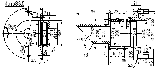 По контуру входного отверстия водозаборник должен иметь фланец шириной 20-35 мм для приформовки к днищу, поэтому болван нужно поставить на основание из толстой фанеры. Далее нужно подготовить закладные части — корпус смотрового лючка, корпус дейдвудного подшипника (рис. 35), воздушный штуцер и планки для крепления решетки.