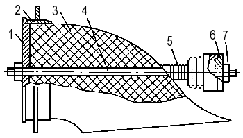 Рис. 36. Схема приспособления для установки корпуса дейдвудного подшипника. 1 — диск, центрирующий гребной вал в статоре; 2 — статор; 3 — болван водозаборника; 4 — фальшвал; 5 — корпус дейдвудного подшипника; 6 — диск, центрирующий вал в корпусе 5; 7— гайка М20.