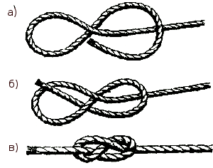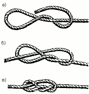 Морской узел восьмерку завязывают на концах снастей или лопарей, чтобы они не выскальзывали из блоков.