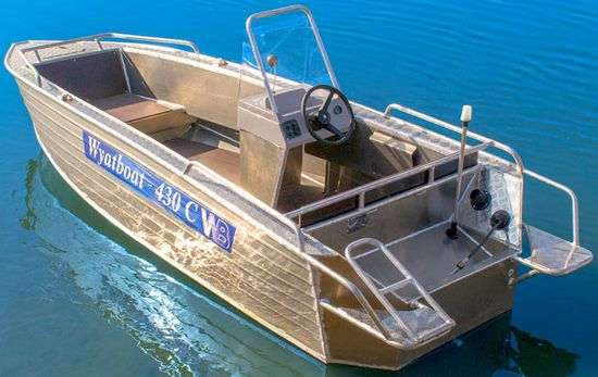 Алюминиевый катер Wyatboat-430C с одной консолью, предназначен для прогулок, рыбной ловли и охоты на реках и озерах при волнении с высотой волны до 0,6 м в районах с умеренным и холодным климатом при температуре воздуха от -5 С до +40 С.