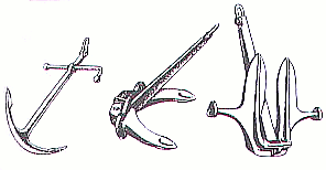 Якорь - специальной формы кованая, литая или сварная конструкция, опускаемая на дно и осуществляющая непосредственно удержание судна через якорную цепь или канат. Коренная смычка якорной цепи (якорный канат) крепится к килю через устройство для быстрой отдачи якоря в натянутом состоянии цепи, называемое жвака - галсом. Усилие, которое якорь воспринимает не перемещаясь и не выходя из грунта, называется держащей силой. Основой конструкции якоря является продольный стержень - веретено, в верхней части которого имеется якорная скоба для крепления якоря к цепи (канату), а в нижней - лапы и рога, прикрепленные к веретену неподвижно (узел крепления носит название тренд) или на шарнире в коробке. Некоторые якоря имеют в верхней части шток - стержень поперек веретена для увеличения держащей силы. Существует большое количество наименований и типов якорей - якорь Терещенко, якорь Роджерса, Сайкса, Смита и т.д., но наибольшее применение на судах нашли якоря адмиралтейский (с неподвижными лапами), Матросова и Холла (с поворотными лапами) (рис. 33)