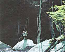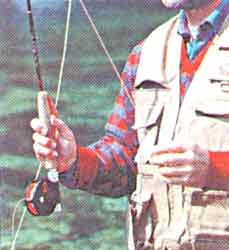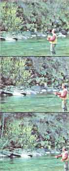 Другой тип заброса - пращевой. Им обычно пользуются при ужении на куколку (нимфу) или мокрую мушку, и он особенно полезен в тех местах рыбалки, где из-за препятствий позади рыболова нельзя отвести шнур назад.