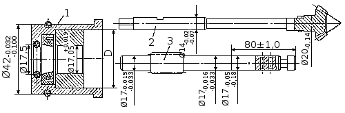 Рис. 66. Посадочные размеры подшипника скольжения гребного вала и вала-шестерни. 1 — стакан 2.212-001 с подшипником скольжения; 2 — вал-шестерня 2.202-020; 3 — гребной вал 2.202-007. Диаметр D стакана 35А, втулки - 35Пр12а
